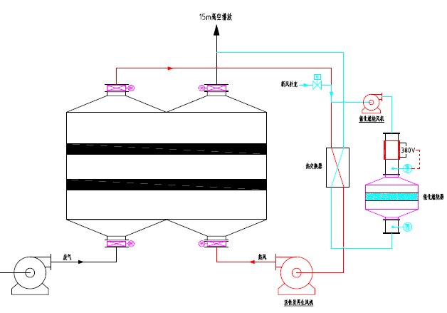 脫臭原理:反應塔內(nèi)裝填特制的固態(tài)復合填料,填料內(nèi)部復配多介質催化劑。當惡臭氣體在引風機的作用下穿過填料層,與通過特制噴嘴呈發(fā)散霧狀噴出的液相復配氧化劑在固相填料表面充分接觸,并在多介質催化劑的催化作用下,惡臭氣體中的污染因子被充分分解。適用范圍:適用范圍廣,尤其適用于處理大氣量、中高濃度的廢氣,對疏水性污染物質有很好的去除率。優(yōu)點:占地小,投資低,運行成本低;管理方便,即開即用。缺點:耐沖擊負荷,不易污染物濃度及溫度變化影響,需消耗一定量的藥劑。
